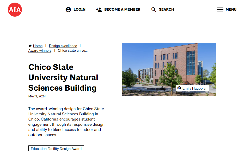 I am delighted to announce that the Chico State Natural Science Building project has been honored with the Education Facility Excellence in Design Award for 2024 at The AIA 2024 Conference! This achievement is a testament to the collective efforts of our SmithGroup team, along with our esteemed consultant design partners, DPR Construction, and the invaluable contributions of stakeholders and students at Chico State.